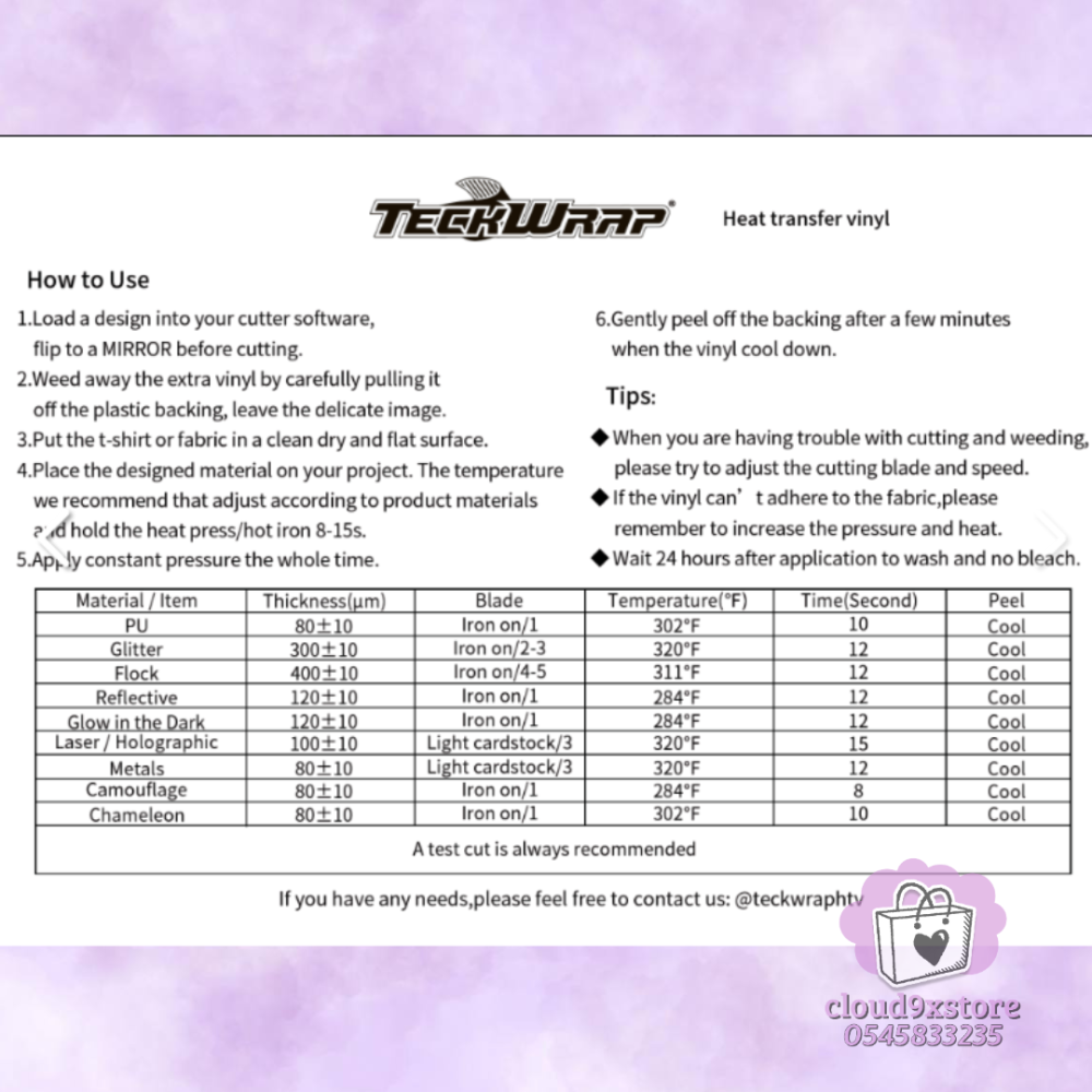 - ينصح بشدة باستخدام المكبس الحراري لتثبيت الفينيل واتباع التعليمات الخاصة بكل نوع من أنواع الفينيل.